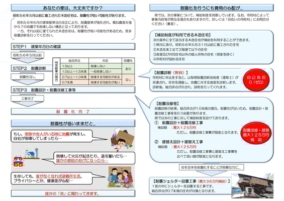 県では、市町村と協調して、昭和56年5月以前に着工した木造住宅を対象に、耐震化に対する補助事業を実施しております。我が国では大地震はいつ、どこで発生してもおかしくない状況であり、生命や財産を守るためには、住宅や建築物の耐震化を図ることが重要です。